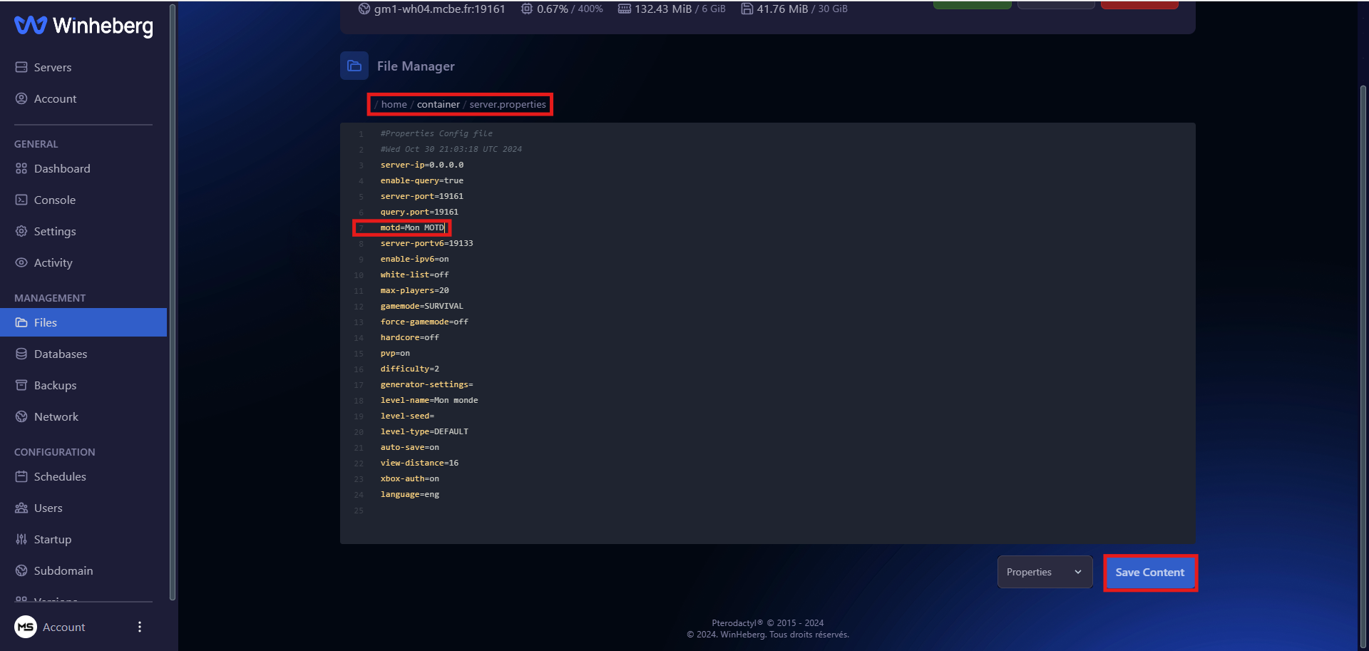 Ouvrez le fichier /server.properties, rendez-vous à la ligne 7, puis modifiez l'entrée motd= en remplaçant le MOTD actuel par celui voulu et sauvegardez les changements du fichier en cliquant sur "save content".