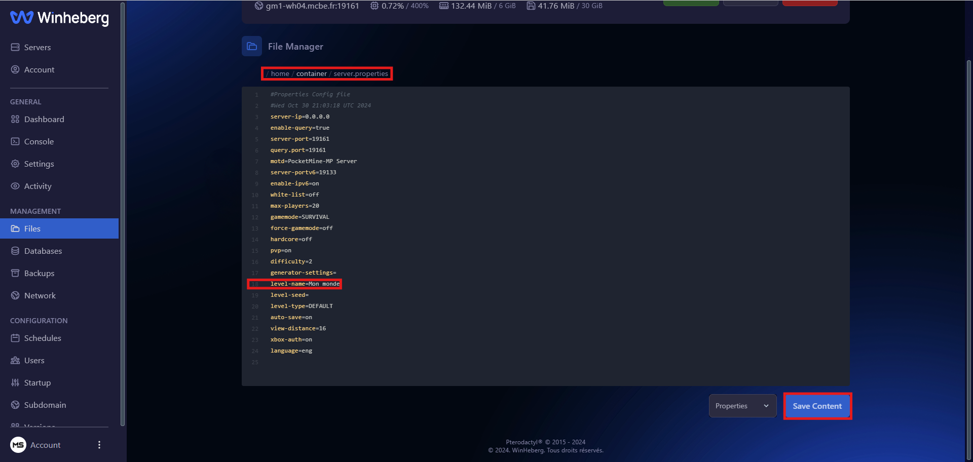 Ouvrez le fichier /server.properties, rendez-vous à la ligne 18, puis modifiez l'entrée level-name= en remplaçant par le nom de votre map souhaitée et sauvegardez les changements du fichier en cliquant sur "save content".