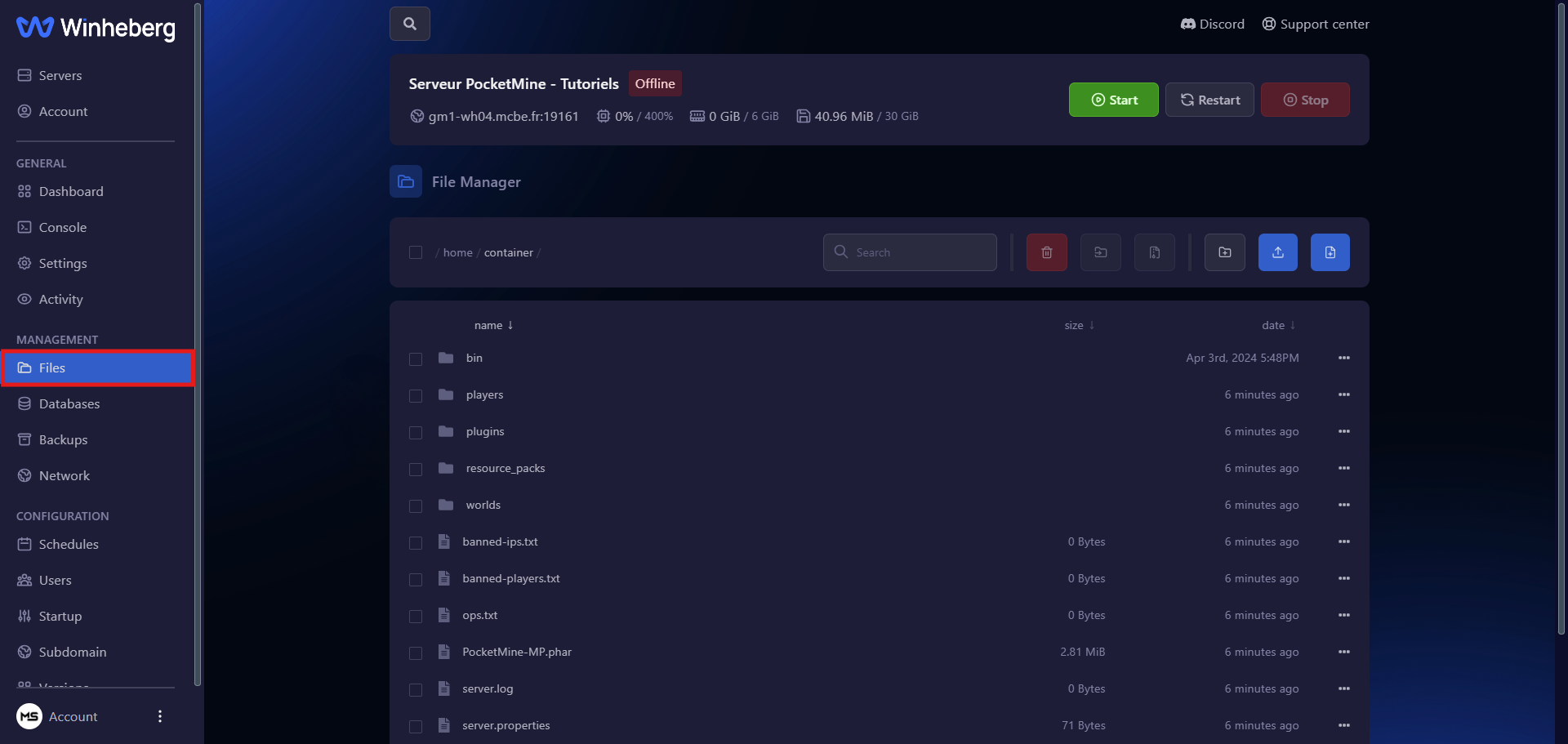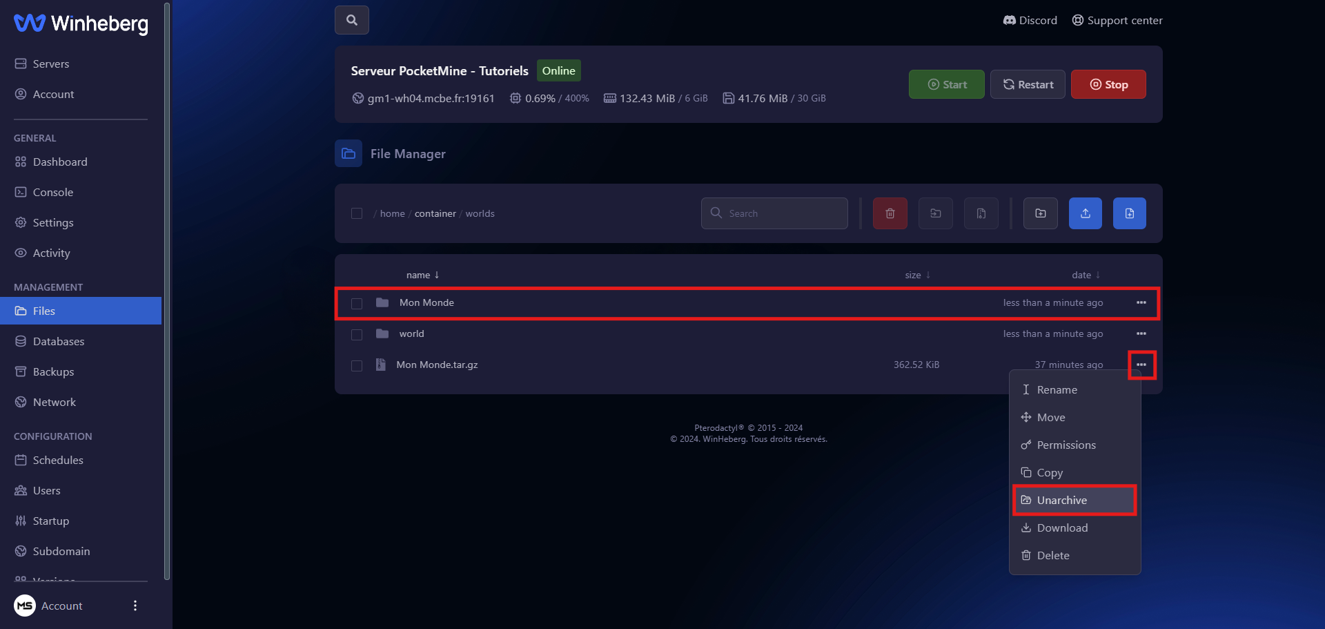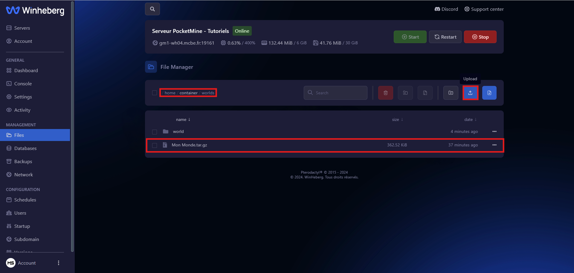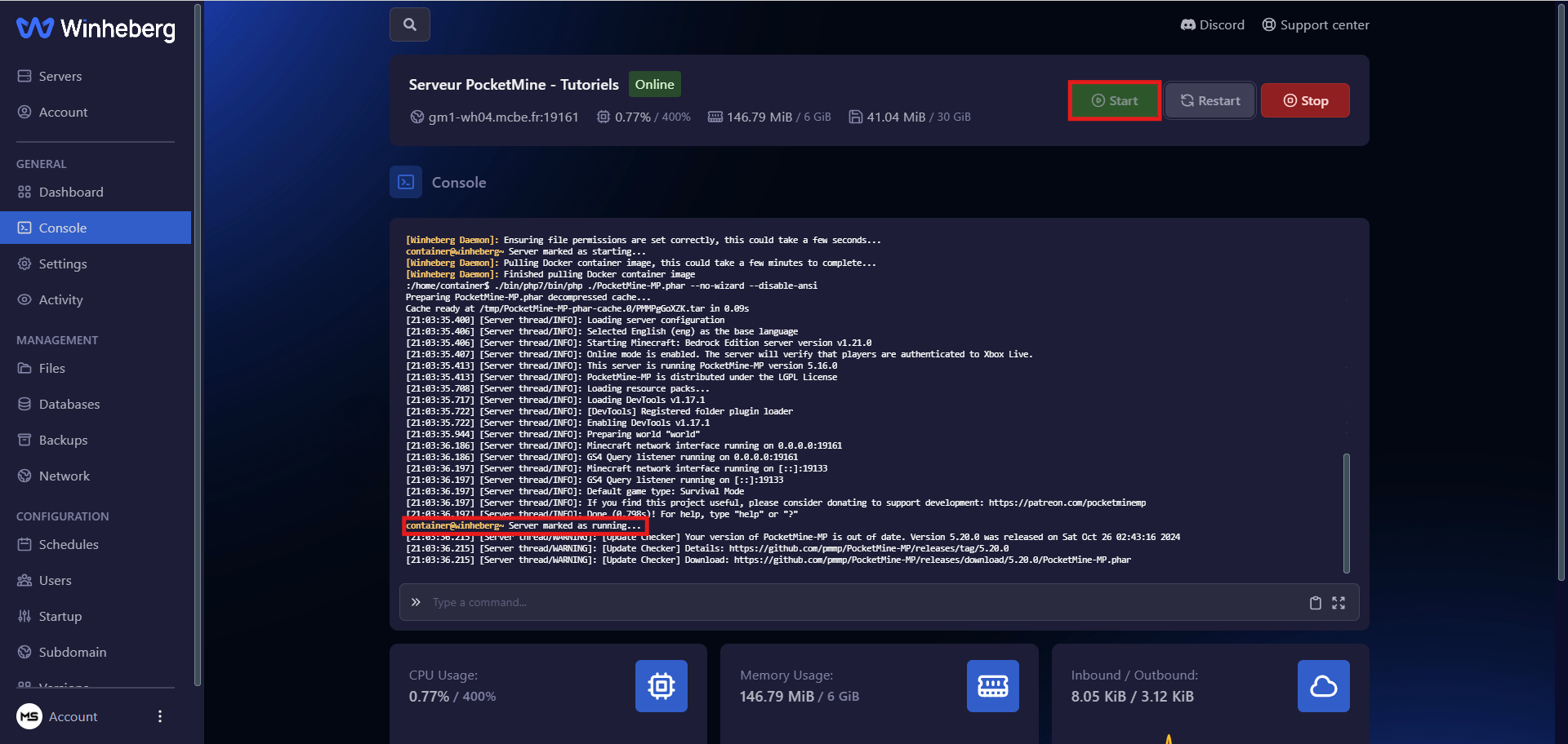 Enfin, redémarrez votre serveur dans l'onglet Console pour appliquer les changements.